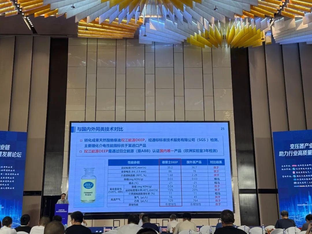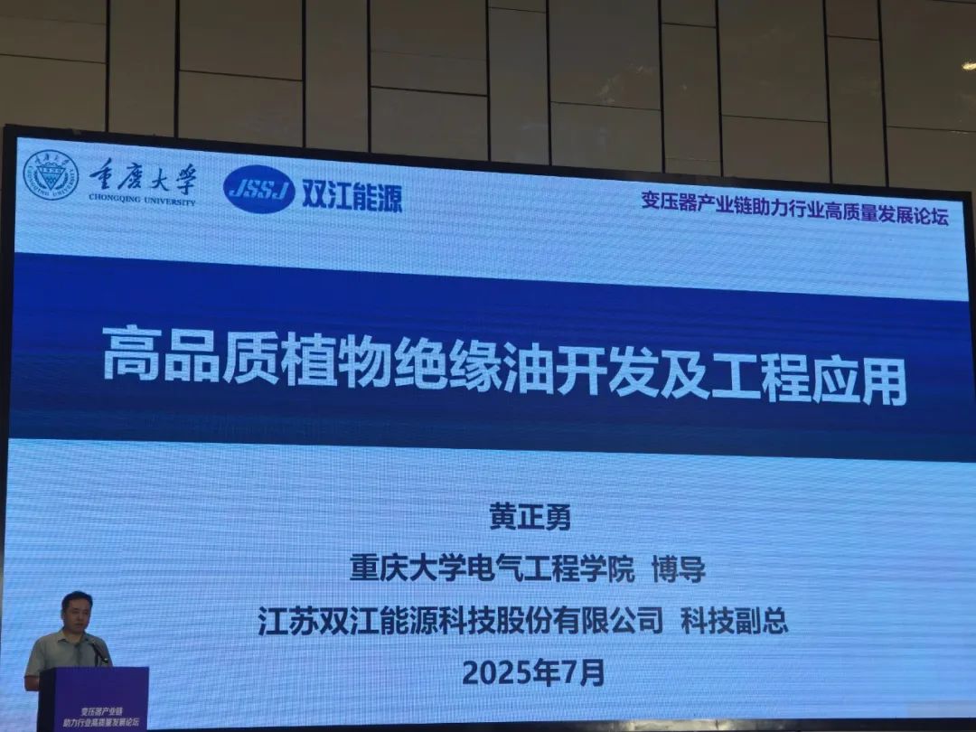 31日下午,重慶大學博導、雙江能源科技副總經(jīng)理黃正勇受邀發(fā)表演講。黃正勇副總經(jīng)理圍繞《高品質(zhì)植物絕緣油開發(fā)及工程應用》這一主題,聚焦國家"雙碳"戰(zhàn)略下變壓器行業(yè)對環(huán)保、安全、高性能絕緣材料的迫切需求,系統(tǒng)地介紹了雙江能源在電力絕緣材料領(lǐng)域的最新突破。