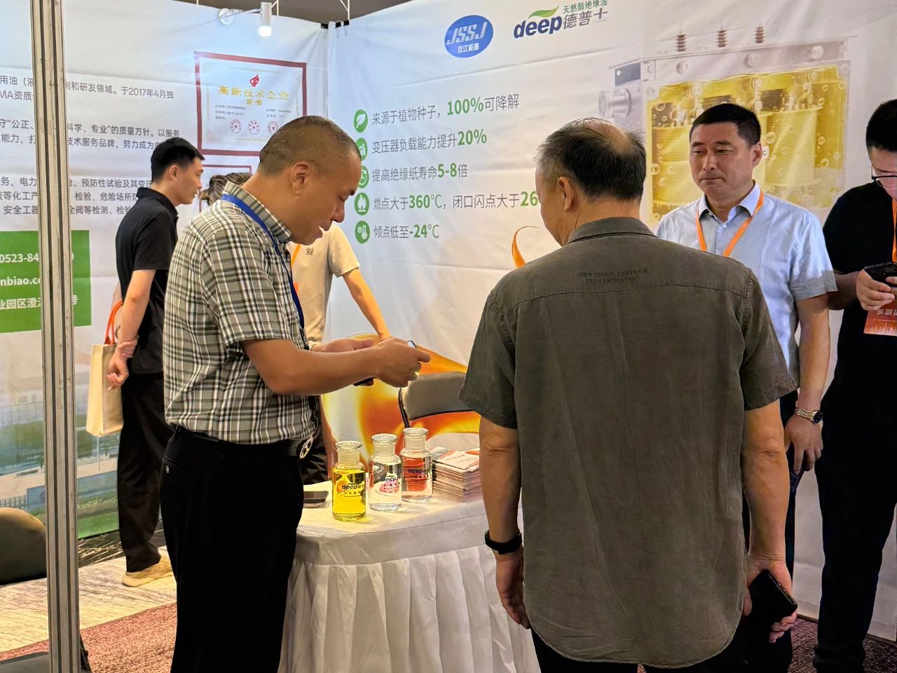 在同期舉辦的變壓器產(chǎn)業(yè)鏈產(chǎn)品展示會上,雙江能源展出了天然酯絕緣油、合成酯絕緣油以及礦物絕緣油等產(chǎn)品,產(chǎn)品以其卓越的性能表現(xiàn)、突出的環(huán)保特性以及顯著的技術(shù)優(yōu)勢,吸引眾多客商深入咨詢、駐足洽談。